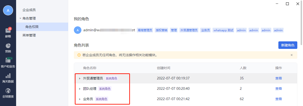 注意:只要管理后台设置了外贸通管理员,是可以自动同步到外贸通管理员角色里面的。所以外贸通管理员是只可以查看不可以添加帐号。团队经理和业务员是可以直接添加帐号