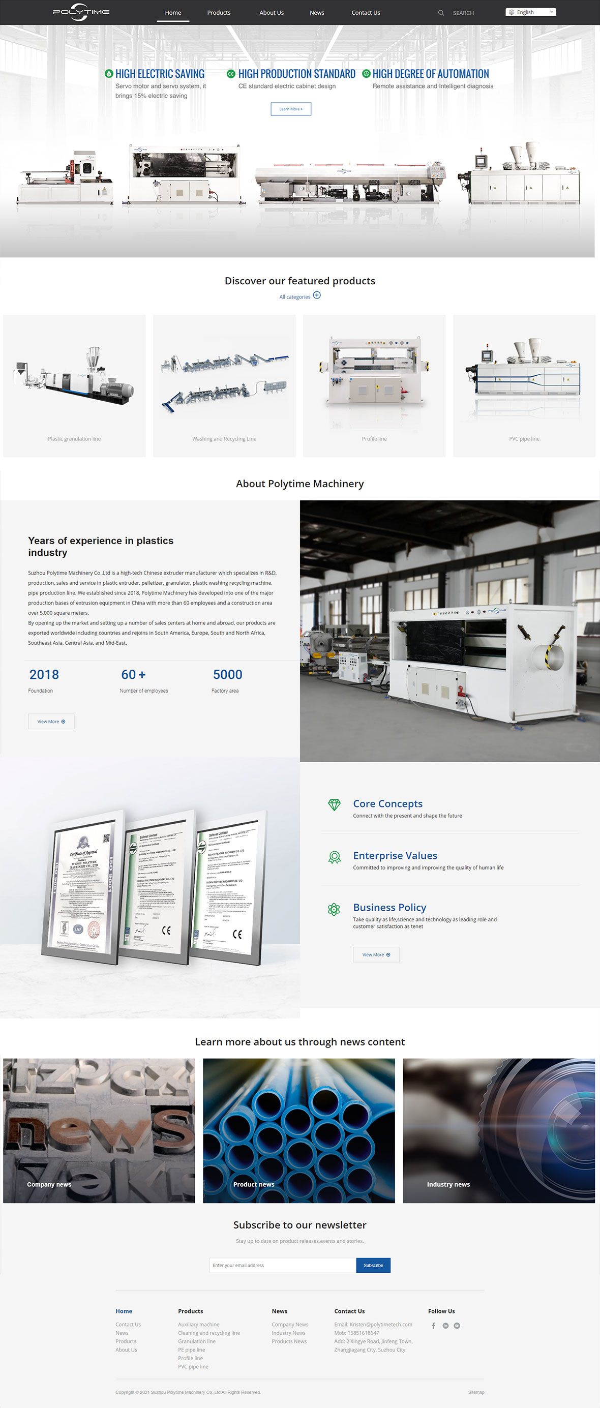 今天给大家分享的是一个挤出设备的外贸网站,网站整体是一个简约风格,banner部分选了三款主推产品以及产品的三个优势,文案搭配按钮吸引客户点击了解更多,banner整体比较简约大气。接下来选用四款特色产品,这一部分采用比较简约大气的方式展现,点击产品可以进入查看更多产品。公司简介部分,向客户介绍公司的发展背景以及公司的销售市场,用滚动数字向客户传达我们公司的规模,接下来向我们展示公司的核心观念等一些企业文化,左侧的证书展示可以让客户对公司产生信任感。可以让客户更加详细的了解我们。最后通过新闻内容了解更多关于公司的信息,利于谷歌优化。